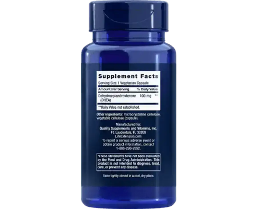 DHEA 100mg Life Extension é um suplemento 100% puro DHEA, hormônio produzido pelas glândulas suprarrenais, no qual é convertido em testosterona nos homens e estrogênio nas mulheres.