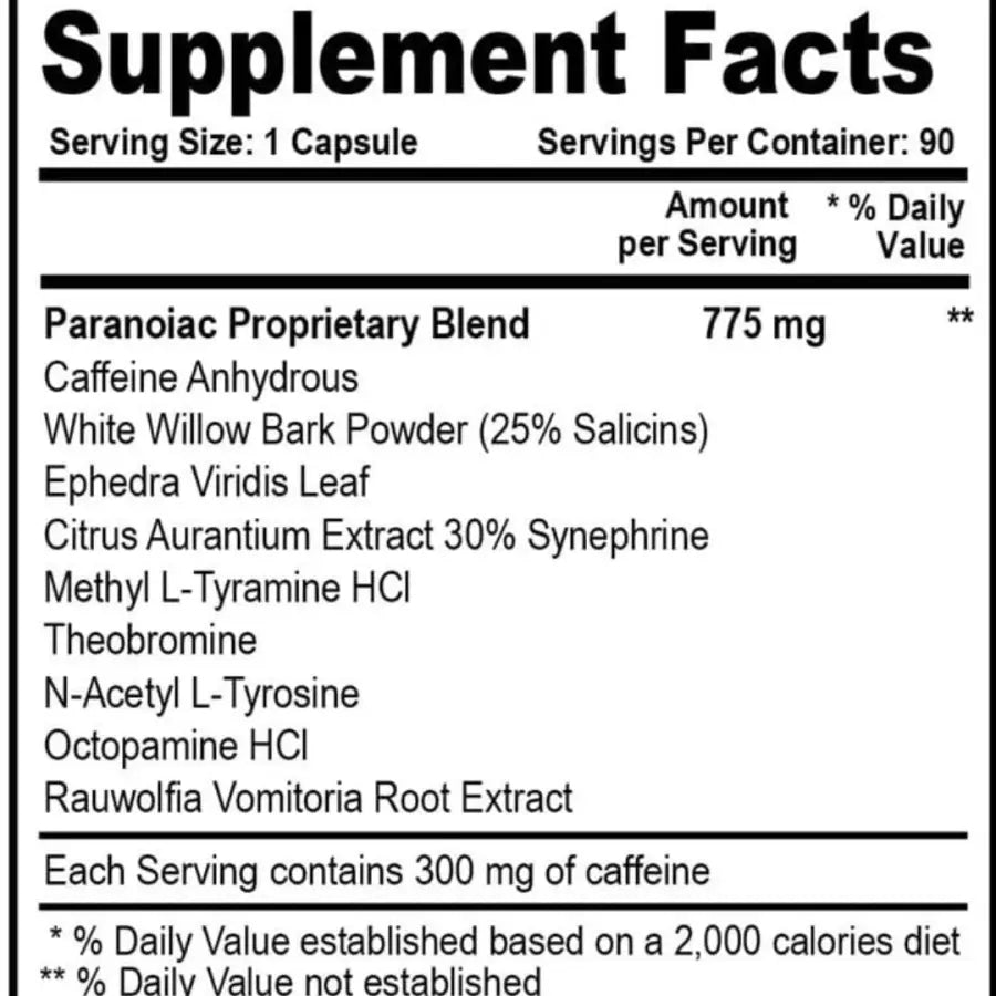 Com 65 mg por cápsula, o Paranoic Extreme Fat Burner combina estimulantes potentes que fornecem energia explosiva, disposição prolongada e suporte ao emagrecimento, sendo indicado para atletas e praticantes de musculação que desejam resultados extremos.